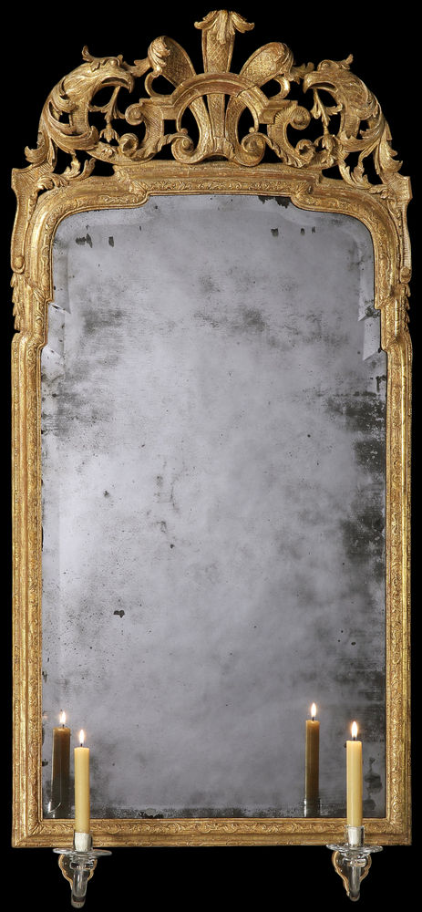 Note: The glass arms, sockets and supports are restorations. The mirror retains the original shaped and bevelled mirror plate and most of the original gesso and gilding.